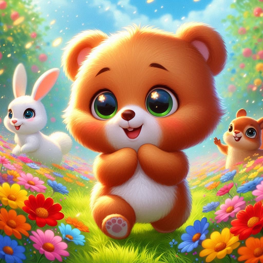 Once upon a time in a colorful forest filled with tall trees and vibrant flowers, there lived a cute little bear named Benny. Benny was a fluffy cub, with soft caramel-colored fur and big, round eyes that twinkled like stars. He loved to explore the world around him, always eager for a new adventure.